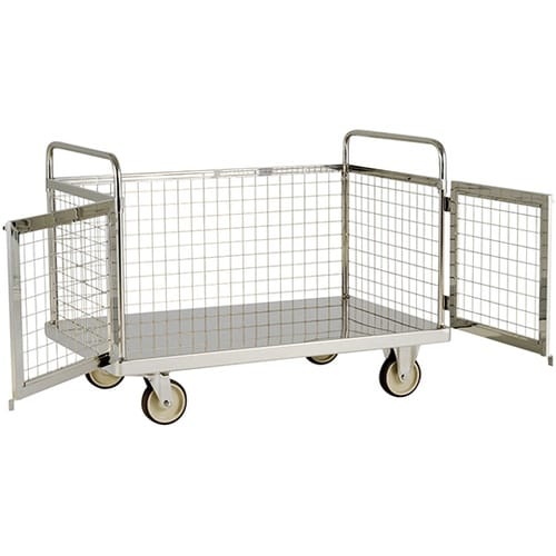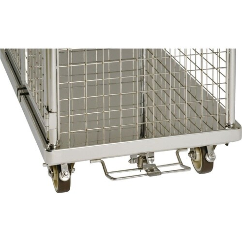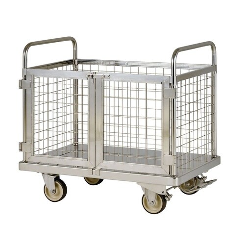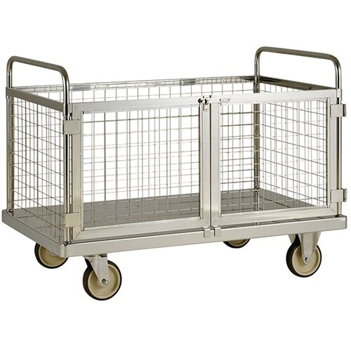キャスター部を除く全ての部品はSUS304製ですので、サビや汚れに耐え清潔にご利用いただけます。形状の定まらない不安定な物や製品の搬送において、金網付きの為、転落事故等を防ぎます。 |