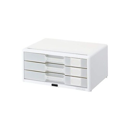 セキュリティホール付鍵2本付デスクまわりが明るくなる、爽やかなオールホワイトカラーで、樹脂製引出しに施錠機能が付いたカギ付レターケースです。1つのカギで全段の施解錠ができます。 |
