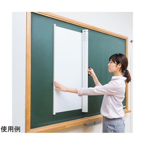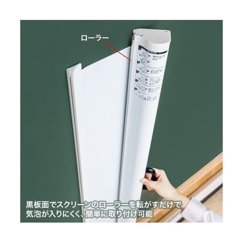 スチール面や黒板にマグネットで取り付けできるプロジェクタースクリーンです。黒板面で内蔵のローラーを転がすことで、気泡が入りにくく簡単な取り付けが可能です。 |