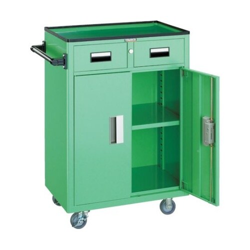 扉はシリンダー錠付で工具部品の管理に役立ちます。天板マット付です。扉と引出し付で、全てに錠がかかり、工具の保管に適しています。溶接構造のため堅牢で、耐久性に優れています。 |