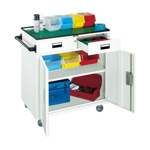 扉はシリンダー錠付で工具部品の管理に役立ちます。天板マット付です。扉と引出し付で、全てに錠がかかり、工具の保管に適しています。溶接構造のため堅牢で、耐久性に優れています。