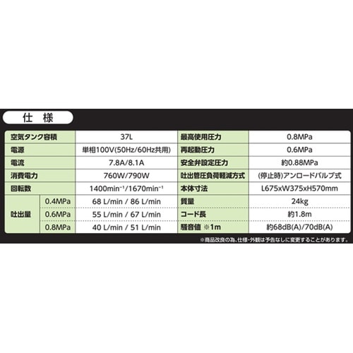 オイルレス式:給油が不要なのでメンテナンスが簡単です。オート圧力機能:タンク内の圧力が0.8MPaまで上昇すると自動停止するので安全です。