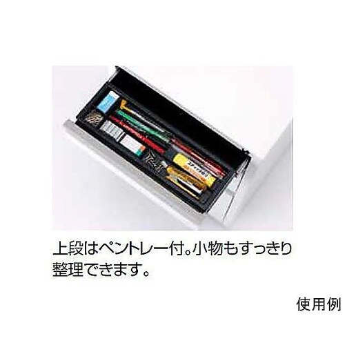 オールロック機構、鍵2本、仕切板1枚付下段にはA4ファイルが収納可能です。省スペース設計で奥行きの少ないデスクにもスッキリ収納可能上段はペントレー付。小物もスッキリ整理できます。仕切り板1枚付。 |