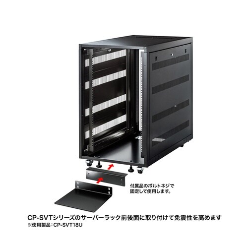 CP−SVT9U、CP−SVT18Uのサーバーラックに取り付け可能な前後用のスタビライザーです。前後のどちらにも固定可能で、1枚に対して4本のボルトネジで本体に取り付けたブラケットに固定する方法です。 |
