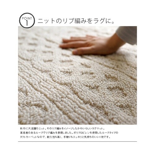 洗えるタフトラグ。ニットのリブ編みを高低差のある織り方で表現しました。イメージしたかわいらしいラグ。ご家庭の洗濯機で洗え、ホットカーペットカバーとしてもご使用頂けます。