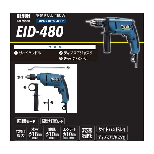 金属・木材・樹脂・コンクリート・レンガ・ブロックの穴あけに。回転モード/回転+打撃モード切替。回転方向切替スイッチ:チャック部が正・逆の2通りに回転。ディプスアジャスタ:穴あけの深さを調整可能。 |