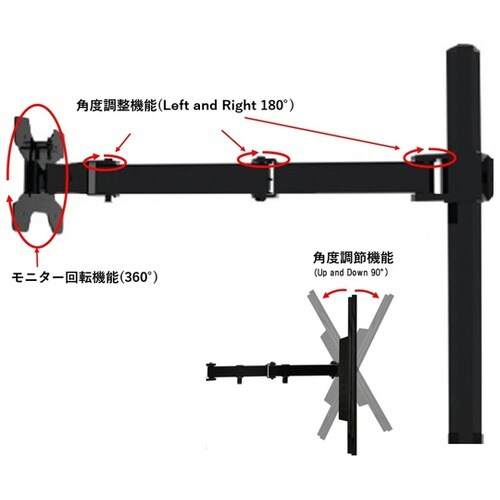 シングルモニタークランプ式スタンド。高さ/角度を調節可能。使用者にとって一番良いポジションで画面を確認する事が出来ます。またモニター下のスペースを確保する事でデスクを広く使用できます。 |