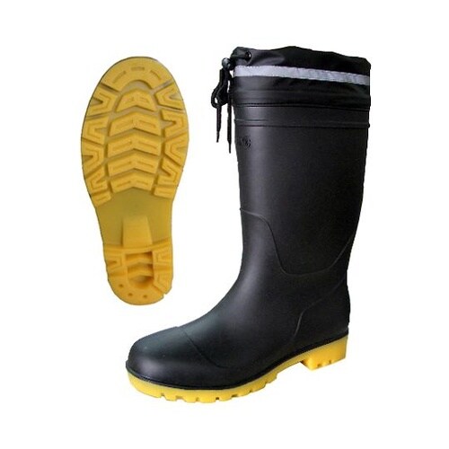 履き口に反射材を付け、視認性に優れます。鋼鉄先芯を使用しています。耐油性に優れた塩化ビニール製です。
