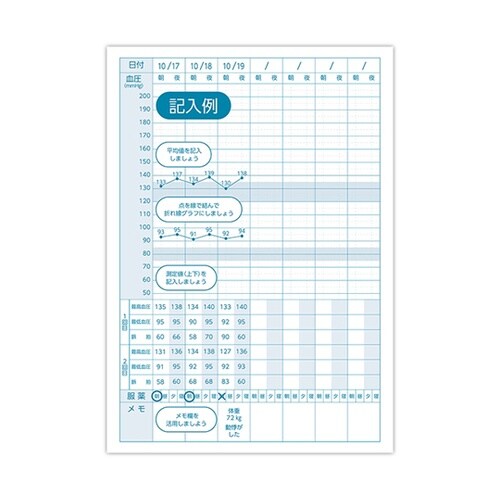 大きくて見やすいB6サイズのグラフ式血圧手帳。患者さんにもわかりやすい医薬品情報「くすりのしおりR」を提供している一般社団法人くすりの適正使用協議会と共同製作した血圧手帳です。 |
