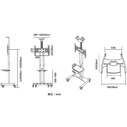 ローラー付きテレビスタンド。移動が簡単棚板:上段・中段に棚板が付属しています。 |