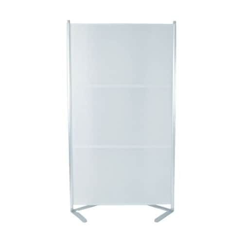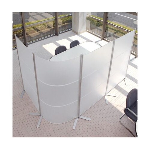 フラットにも、緩やかなカーブにもなるパーテーションです。付属のパーツを使用して、カーブにも十文字にも簡単に連結可能です。パーティションの向こう側がうっすら見える半透明タイプです。 |
