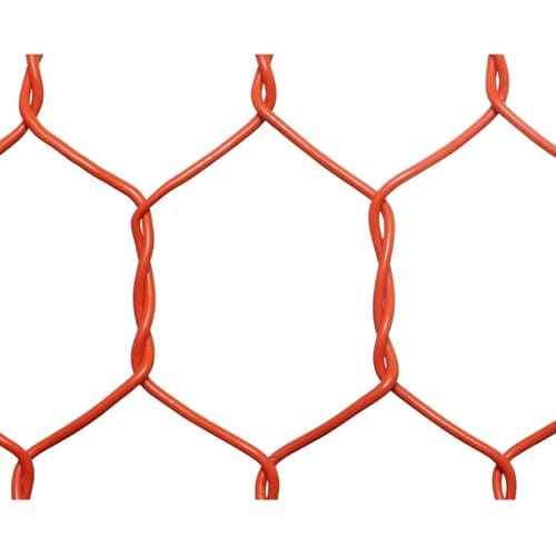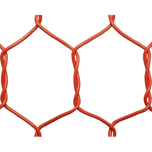 表面にビニール被覆を施し線材を交互にねじり合わせ六角形の網目をした金網です。軽量で取り扱いが容易で切断したり引き伸ばしてもほつれる事が少ない。