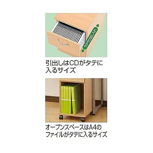 引出しはCDがタテに入るサイズ。オープンスペースはA4のファイルがタテに入るサイズ。 |