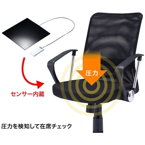 座面内にセンサーを内蔵しています。SSSクラウドサービスにご契約頂ければオフィスの着座状況などがひと目で分かるようになります。背面がメッシュで通気性抜群です。 |