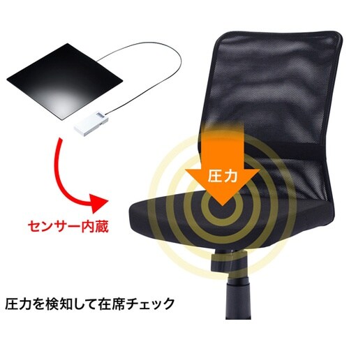 座面内にセンサーを内蔵しています。SSSクラウドサービスにご契約頂ければオフィスの着座状況などがひと目で分かるようになります。背面がメッシュで通気性抜群です。 |