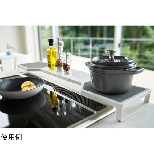 コンロ奥を有効活用できるラック。伸縮式でコンロの幅にぴったりフィット。フライパンや小鍋の一時置きに便利!熱に強く滑りにくいシリコーンマット付き。汚れてもサッと洗い流せます。 |