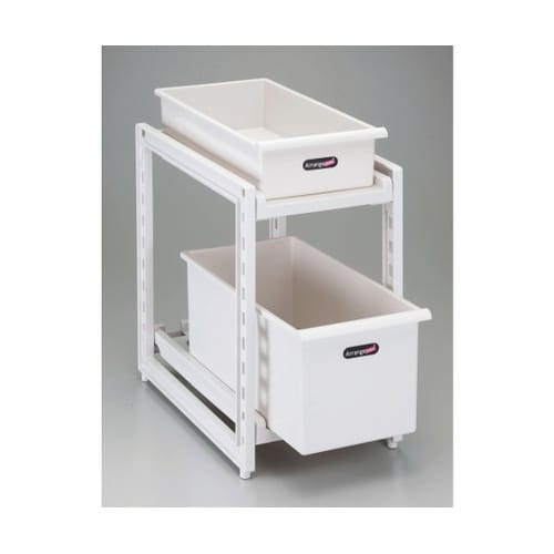 シンク下を使いやすく、すっきりと収納できます。棚段調節が可能。下段は重いボトル等の出し入れに便利な深型タイプ。 |