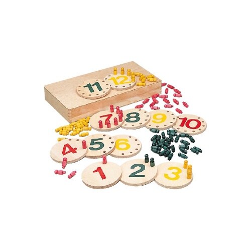 セット内容:円盤12、ペグ90(赤、黄、緑各30)、収納木箱付き | 材質:円盤=シナ合板(数字シルク印刷) ペグ=ブナ | 寸法: 円盤=直径15×…