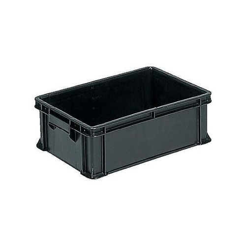 積み重ね可能導電性を有するコンテナで、電気・電子部品のコンテナ使用に適しています。低い電気抵抗 2点間表面抵抗値10^6Ω/cm以下です。したがって 静電気破壊及びホコリの付着を完全に防止します。 |