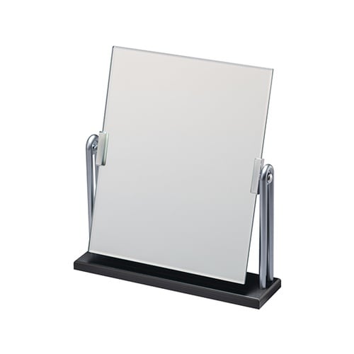 メイクに便利な卓上ミラー。幅広面取りをした豪華な5ミリ厚ミラーを使用したスタンドミラー。台座はインテリアにマッチするMDF木材を使用、支柱はシルバー塗装を施しスタイリッシュ。