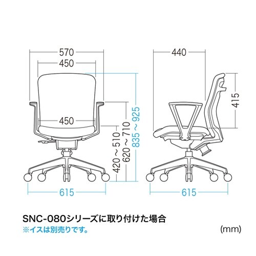 SNC−080シリーズ用の肘パーツです。肘なしのSNC−080シリーズを肘掛け付きにするオプションです。左右1本ずつの2本セットです。取り付け用のボルト付きです。 |