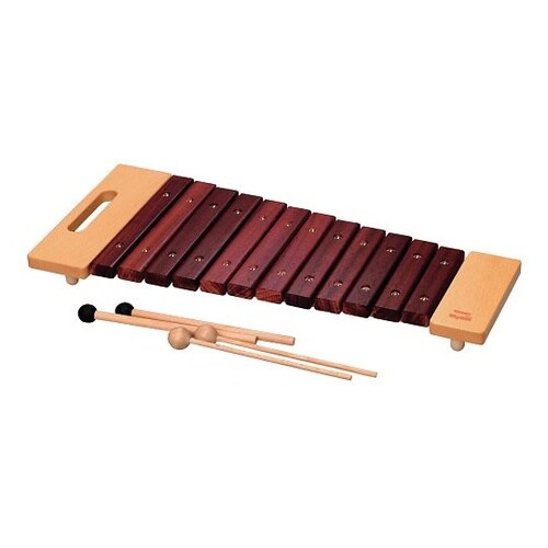 演奏しやすいように手前が低めになっています。きれいな澄んだ音が楽しめる木製マレットに加え、優しくて暖かい音色のゴム製ボールが付いたマレットが付いています。ゴムのマレットは持ちやすい太めの握り棒です。 |