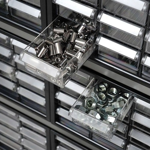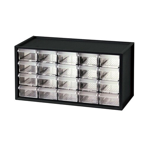 20個の引き出しの付いたパーツボックスです。引き出しは落下防止装置がついています。ボックスは積み重ねや拡張が自由自在背面に組み込まれた鍵穴で壁に取り付けも可能です。 |