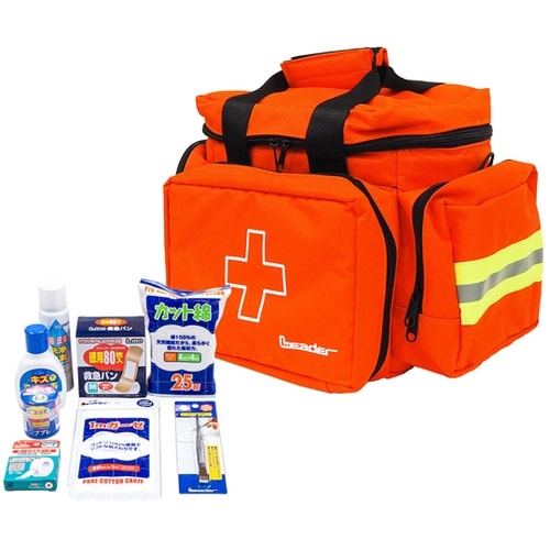 学校・事業所はじめ一般家庭への常備向け救急バッグです。生地に樹脂コーティングを施しているため軽くて撥水・防塵性があります。8種類の衛生材料を標準装備しています。 |