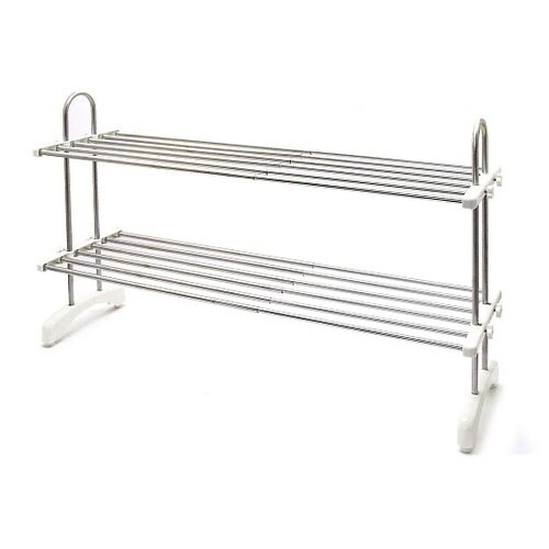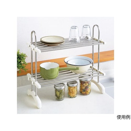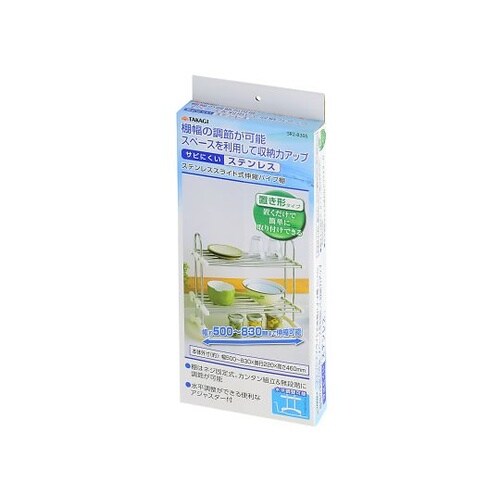 サビにくいステンレス製置くだけで簡単に取り付けできる置き形タイプ幅約500ー830mmまで伸縮可能棚は棚固定式。 |