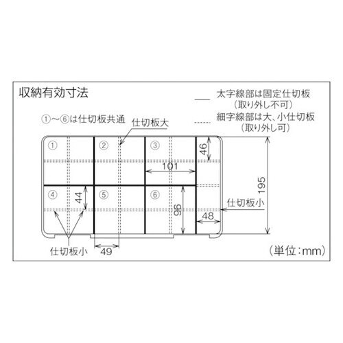 仕切りの組み替え(大・小)が自由自在です。収納部品が取り出しやすく底部がアールになっています。外から中身が見えます。本体、中皿ともABS樹脂製で丈夫です。 |