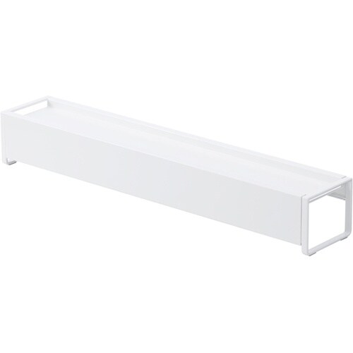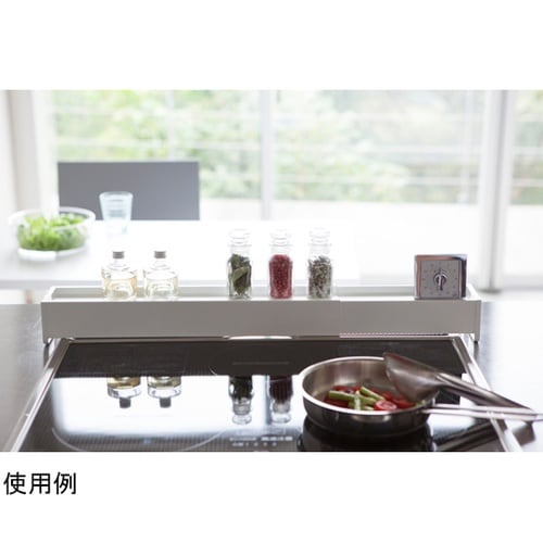 スパイスや調味料などが置けるガード付きの棚で排気口の上を有効活用!グリル使用時は後ろへずらすだけ。 |