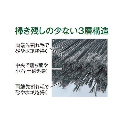 両先端が先割れ毛で砂やホコリを掃きます。保管の際は、毛先を上に向けて立てるか、毛先が地面につかないように吊るしてください。タフで弾力があり、土砂・塵・ホコリなどをしっかりとれます。 |
