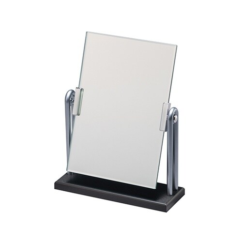 メイクに便利な卓上ミラー。幅広面取りをした豪華な5ミリ厚ミラーを使用したスタンドミラー。台座はインテリアにマッチするMDF木材を使用、支柱はシルバー塗装を施しスタイリッシュ。