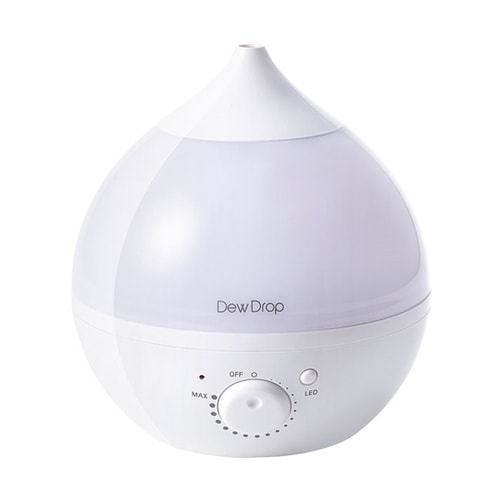 オブジェのようなぽってりとしたしずく型の洗練されたフォルムが魅力的なアロマ加湿器「デュードロップ」。白のLEDランプも搭載しているので、ムーディな雰囲気を楽しみたいときにはライトスイッチをON。 |