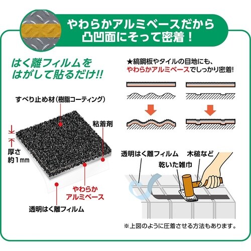 転倒転落スリップ事故を防止する屋外用スベリ止めテープです。雨で濡れる場所やすべりやすい材質の面には特に有効です。やわらかアルミベースだから凸凹面にそって密着。 |