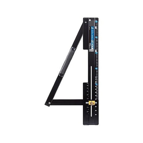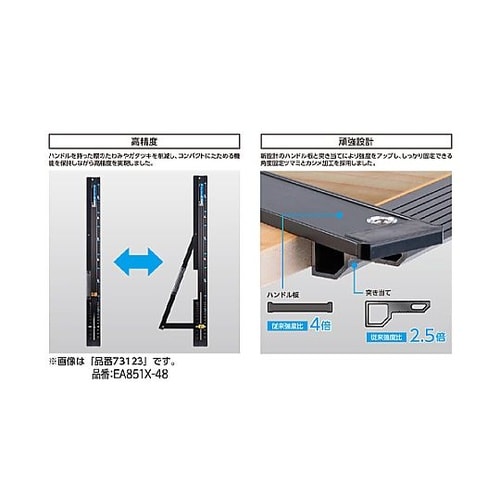 突き当てが畳めるのでコンパクトに収納できます。畳んだ状態から開くだけで簡単に丸ノコガイド定規として使用できます。ネジをスリットに沿って直角固定位置に固定するだけで、90°になります。 |