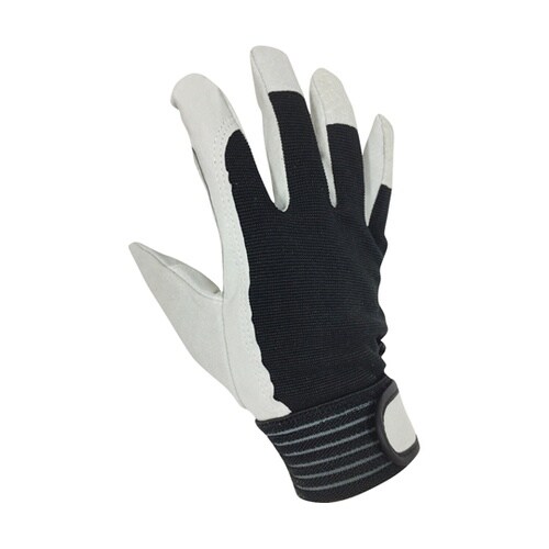 豚床革をやわらかく手袋用になめした、エコノミータイプ豚革手袋。手首のゴムとマジックテープでぴったりフィットします。10双パック。