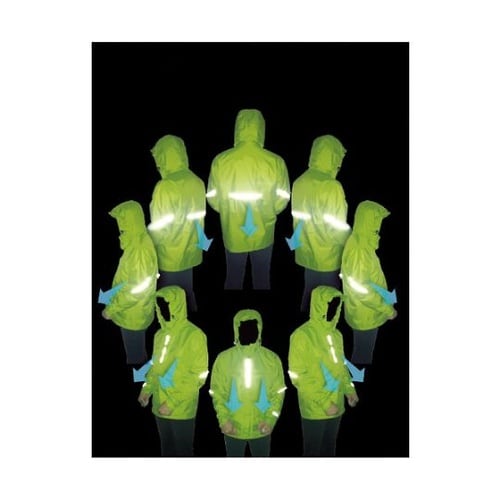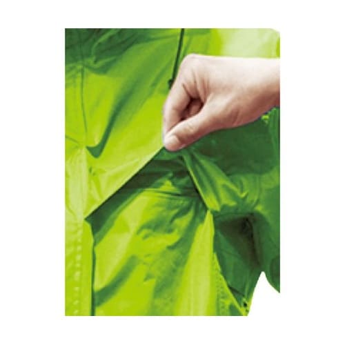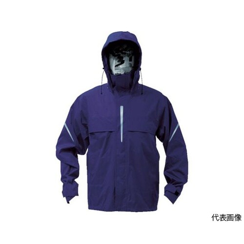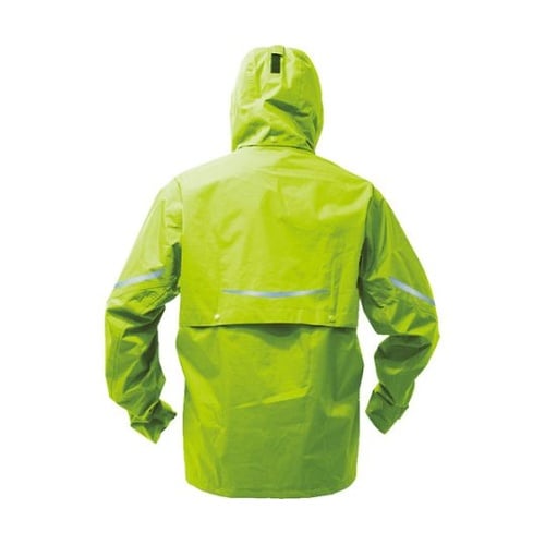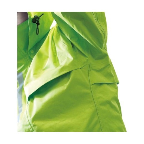 上着には全方位で蒸れを逃がすベンチレーション(通気口)とリフレクター付きです。ヒジが曲げやすく運動性を重視したレインスーツです。雨天時の野外作業。 |