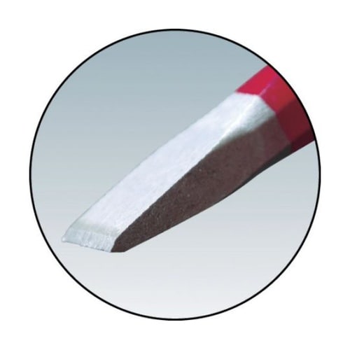 高周波焼入をし、高硬度、耐久力は抜群です。刃先は厚い両刃で割り作業、ハツリ作業に適しています。刃幅に合わせた八角軸径を使用しており、ハンマーの打撃が効率よく刃先に伝わり、打感の良さが実感できます。 |