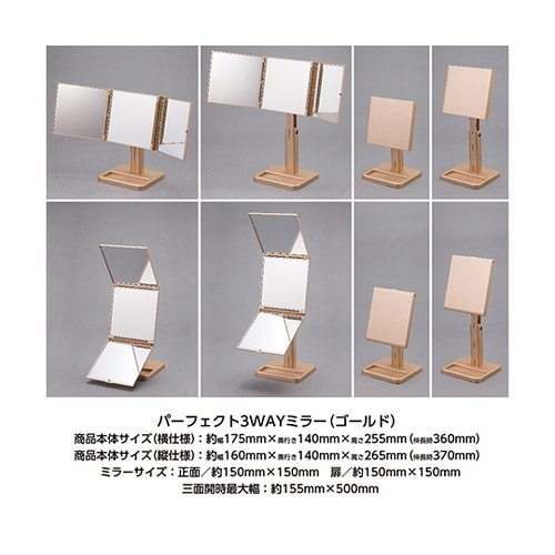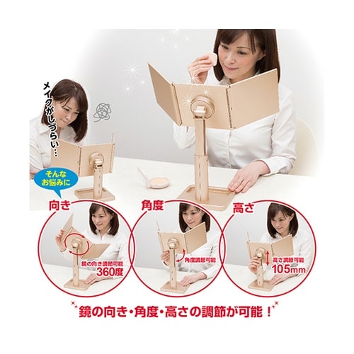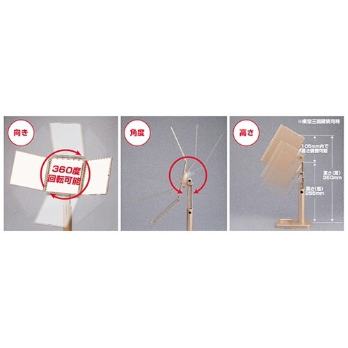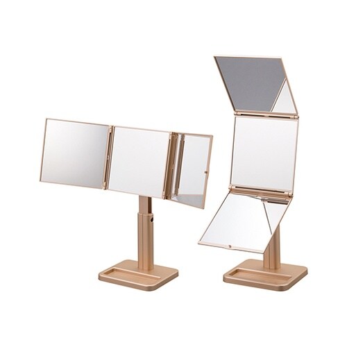 高さ・向き・角度の調整が簡単にできる3面鏡です。鏡面が360度回転しますので横3面鏡だけでなく縦3面鏡としても使用できます。 |