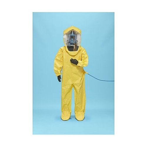 PVCフェイスシールド・袖口ゴム入・ブーティ付・エアーインレット付・排気口付・接着可能なファスナーカバー付・縫い目はバウンドシーム