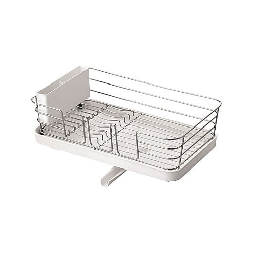 抜群の収納力がある水切りラックです。置きやすく取り出しやすいカトラリーポケットやコップホルダー付きです。水が流れるトレー付きの水切りです。 |