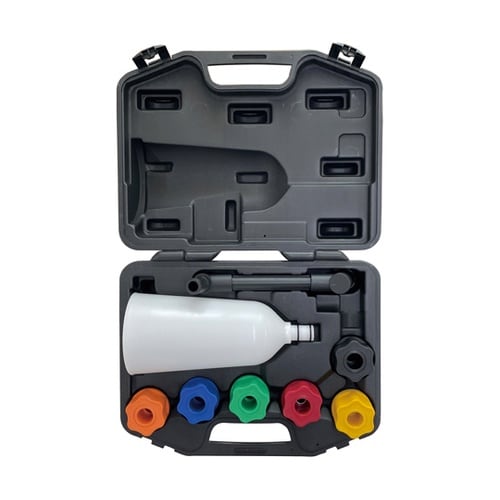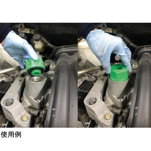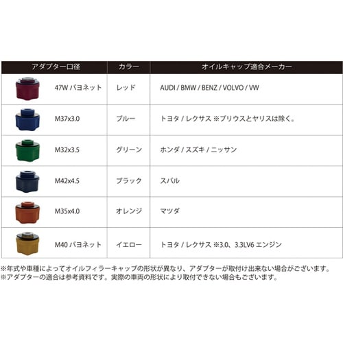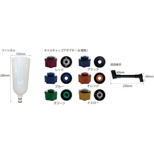 カラフルなアダプターで、様々なエンジンに対応しています。エンジンのオイルフィラーキャップ部分にしっかり固定できます。直径12cmのオイルファンネルでエンジンオイルを注ぎやすくなっています。 |