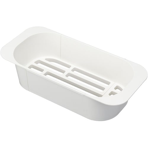 シンクの角にぴったりフィットの伸縮可能な水切りバスケット。シンク内寸38cmー55cmまで伸縮幅に合わせて内容量も伸縮!壁面は穴が開いていないので食器を重ねておいても隙間から落ちる心配がありません。 |
