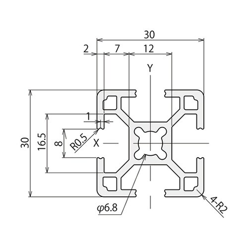 アルミの軽さを維持しながら、独自のフレーム断面で高剛性を実現しました。フレームの溝には専用ナットM3ーM6が挿入でき、様々なボルトとの締結が可能です。 |