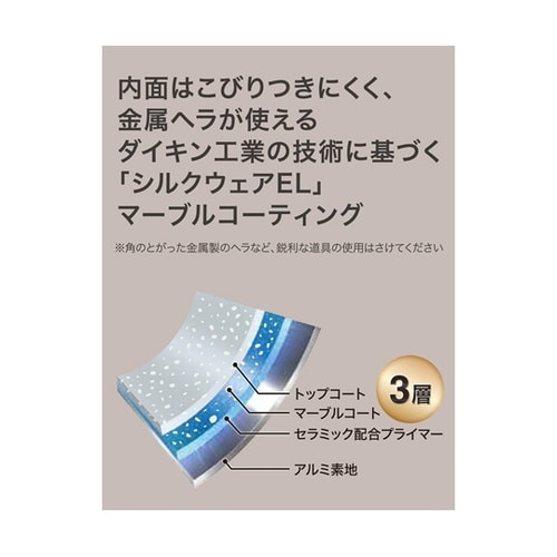 本体・アルミニウム合金、内面・ふっ素樹脂加工、外面・焼付塗装、はり底・ステンレス鋼