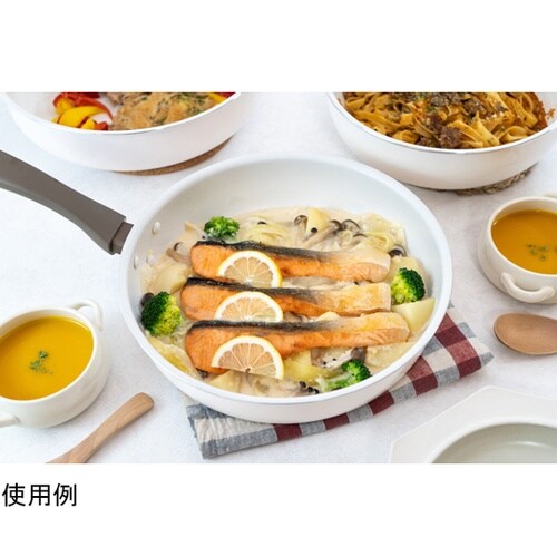 少し深さのある設計で安心して調理できます。内面はPFOAフリーのふっ素樹脂加工を施し、くっつきにくく調理後のお手入れも簡単。IHクッキングヒーターやガスコンロにも対応し、様々な熱源で使用できます。 |