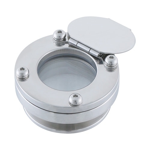 ヘルールから取り外す際にガラスが脱落しないのぞき窓(サイトグラス)に保護カバーを付けました。【NMB】のぞき窓(一体型)をベースに、蝶番式のカバーを取り付けています。 |