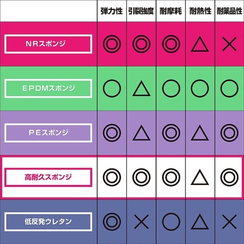耐候性に優れ、屋外での使用に向いています。色移りしにくく、周囲を汚染しにくい材質です。粘着付なので簡単に貼り付けできます防振・スベリ止めなどに。 |