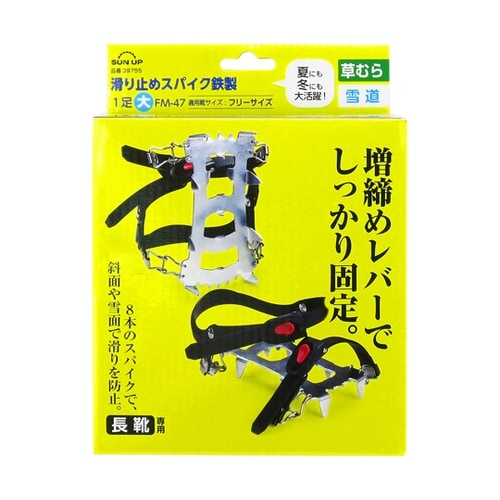 夏にも冬にも大活躍(夏…草刈り・山菜採りなどに。 冬…雪道での転倒防止に。)8本のスパイクで、斜面や雪面で滑りを防止。増締めレバーで、しっかり固定。※本製品は、長靴用です。 |